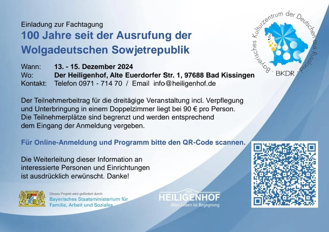 Im Zeitraum vom 13. bis zum 15. Dezember 2024 findet die Fachtagung „100 Jahre seit der Ausrufung der Wolgadeutschen Sowjetrepublik“ im Heiligenhof (Alte Euerdorfer Str. 1, 97688 Bad Kissingen) unter der Schirmherrschaft des Bayerischen Ministerpräsidenten Dr. Markus Söder statt.