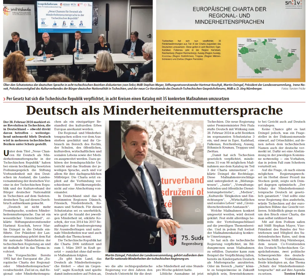 Zum Auftakt der Veranstaltung berichtete Martin Dzingel über das langjährige Bemühen seines Verbandes, die Tschechische Regierung, das Tschechische Parlament und den Tschechischen Staatspräsidenten für eine Stärkung von Deutsch als Landessprache gemäß der Minderheiten-Abkommen des Europa-Rates zu gewinnen.