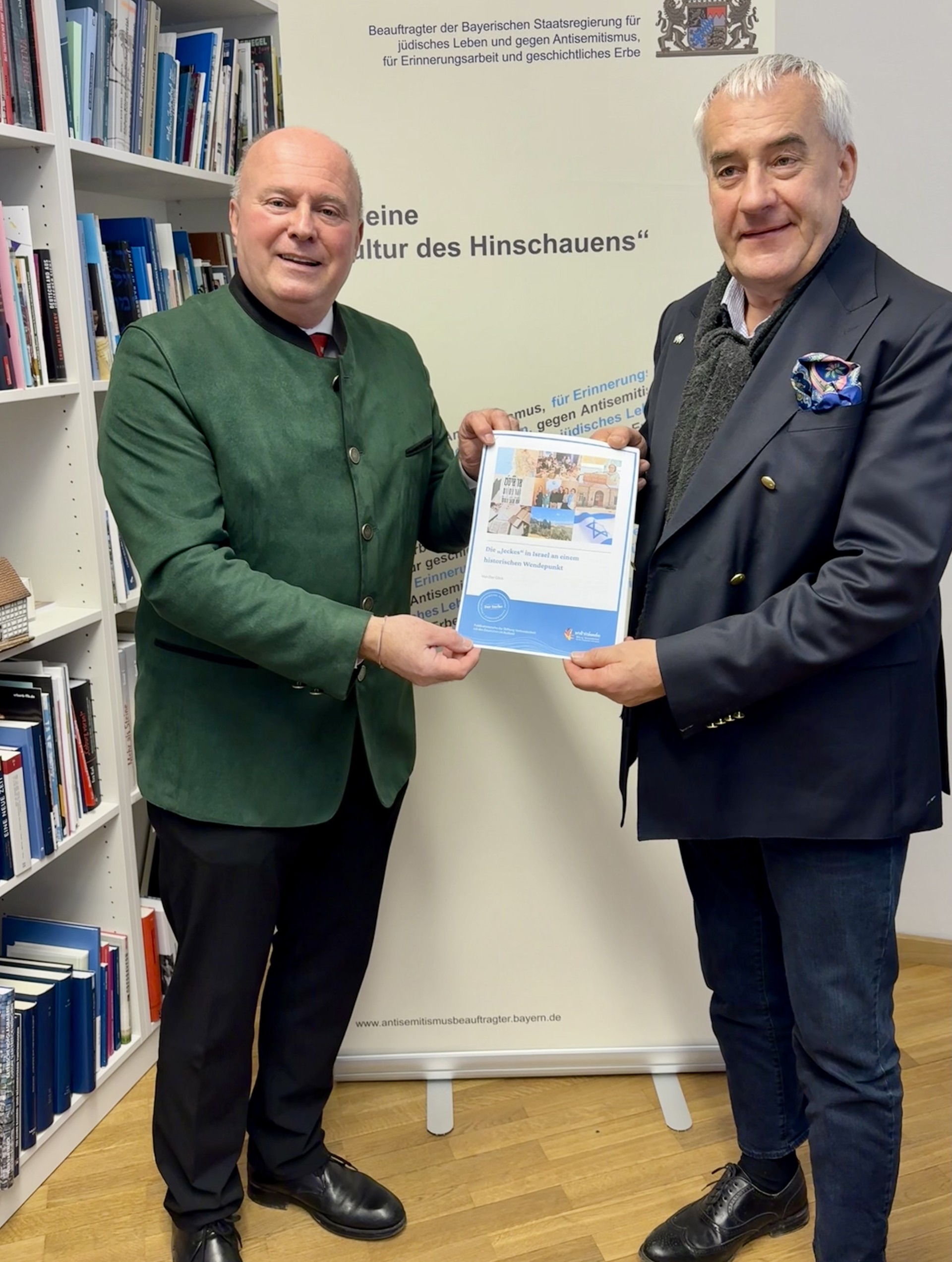 Ein zentrales Thema bildete das Jeckes-Engagement der Stiftung Verbundenheit in Israel, das seit 2025 mit Förderung des Bundesministeriums des Innern umgesetzt wird. Staatsminister a. D. Ludwig Spaenle, Antisemitismus-Beauftragter der Bayerischen Staatsregierung, der das Projekt von Beginn an begleitet und im Namen des Freistaates Bayern ein Kooperationsabkommen mit der Stiftung Verbundenheit unterzeichnet hatte, zeigte großes Interesse an der Weiterentwicklung des Projekts und an neuen Kooperationsformaten zum Themenfeld der Jeckes. Auch Prof. Dr. Otto Weber, Direktor des Hauses des Deutschen Ostens, betonte sein Interesse an einer Vertiefung der Zusammenarbeit mit der Stiftung Verbundenheit, insbesondere im Bereich jüdisches Leben, Erinnerungskultur und historisch-politischer Bildungsarbeit. Staatsminister Joachim Herrmann unterstrich ebenfalls die Relevanz des Engagements der Stiftung in Israel und würdigte die Bedeutung des Projekts für die Pflege der deutsch-israelischen Beziehungen auf zivilgesellschaftlicher Ebene.