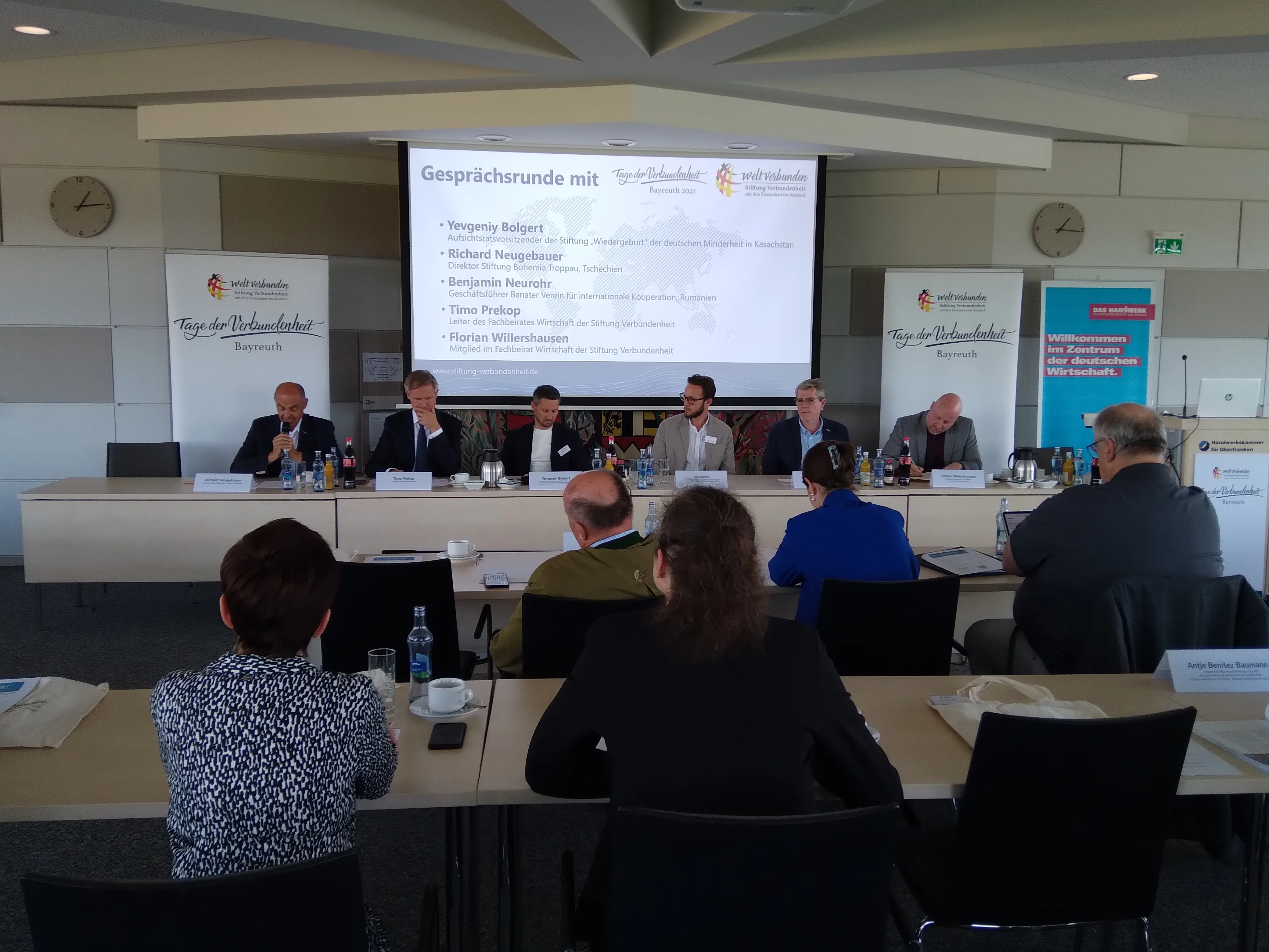 Im dritten Panel, Die Rolle der Wirtschaftsstiftungen,ging es um die Leitfrage: „Wie stärken Wirtschaftsstiftungen deutscher Minderheiten den Mittelstand?“. Die Panelteilnehmer waren Richard Neugebauer ,Direktor der Stiftung Bohemia Troppau aus Tschechien, Benjamin Neurohr, Geschäftsführer des Banater Vereins für internationale Kooperation aus Rumänien, Yevgeniy Bolgert, Timo Prekop, Leiter des neuen Fachbeirates Wirtschaft der Stiftung Verbundenheit und gleichzeitig Landesvorsitzender der Karpatendeutschen Landsmannschaft in Bayern, sowie Florian Willershausen, Mitglied des Fachbeirates.